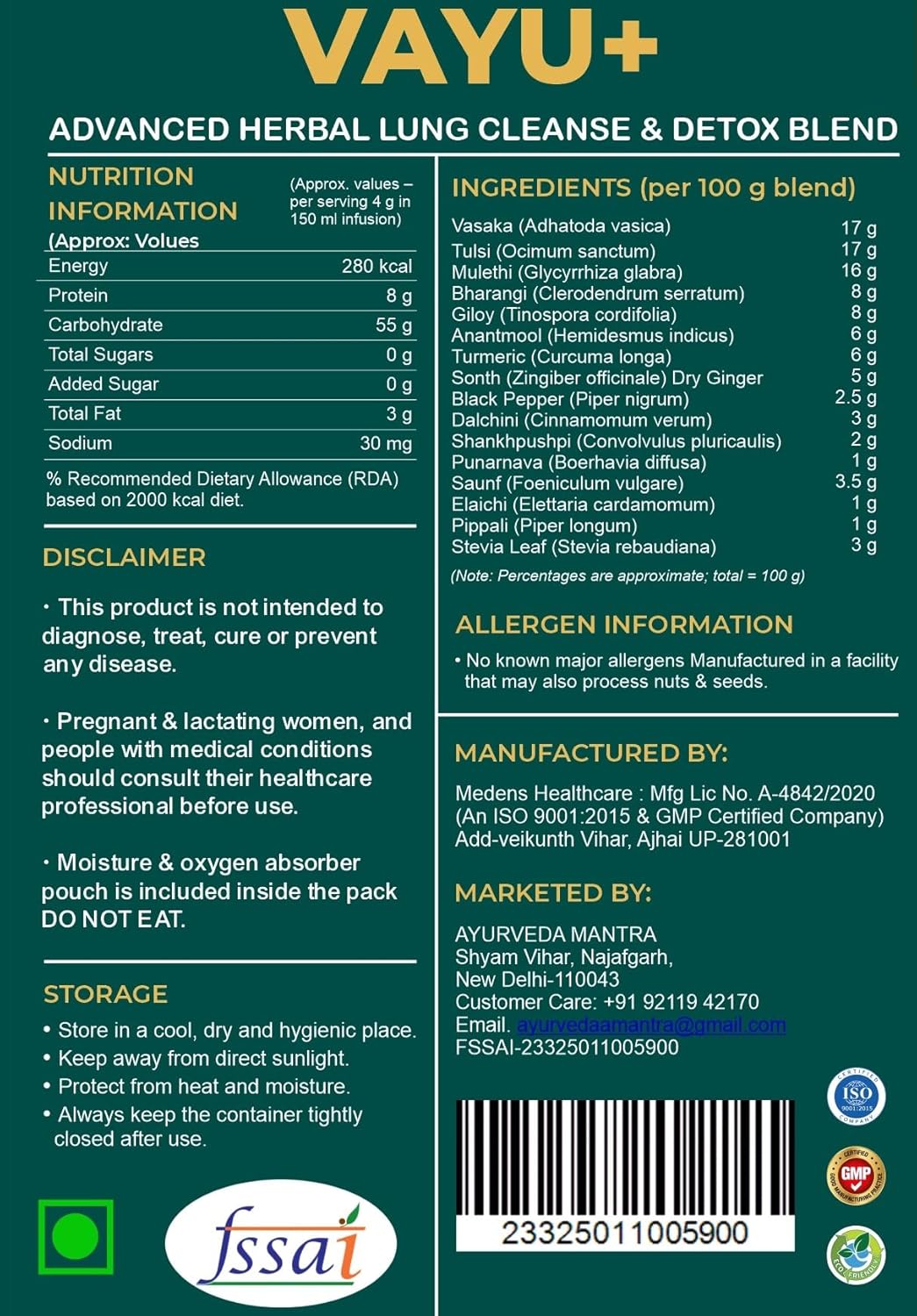 Living in polluted cities can take a toll on your lungs. Vayu+ Lung Support Herbal Tea Powder is a carefully crafted Ayurvedic blend that helps cleanse your lungs, support respiratory health, and improve breathing naturally.